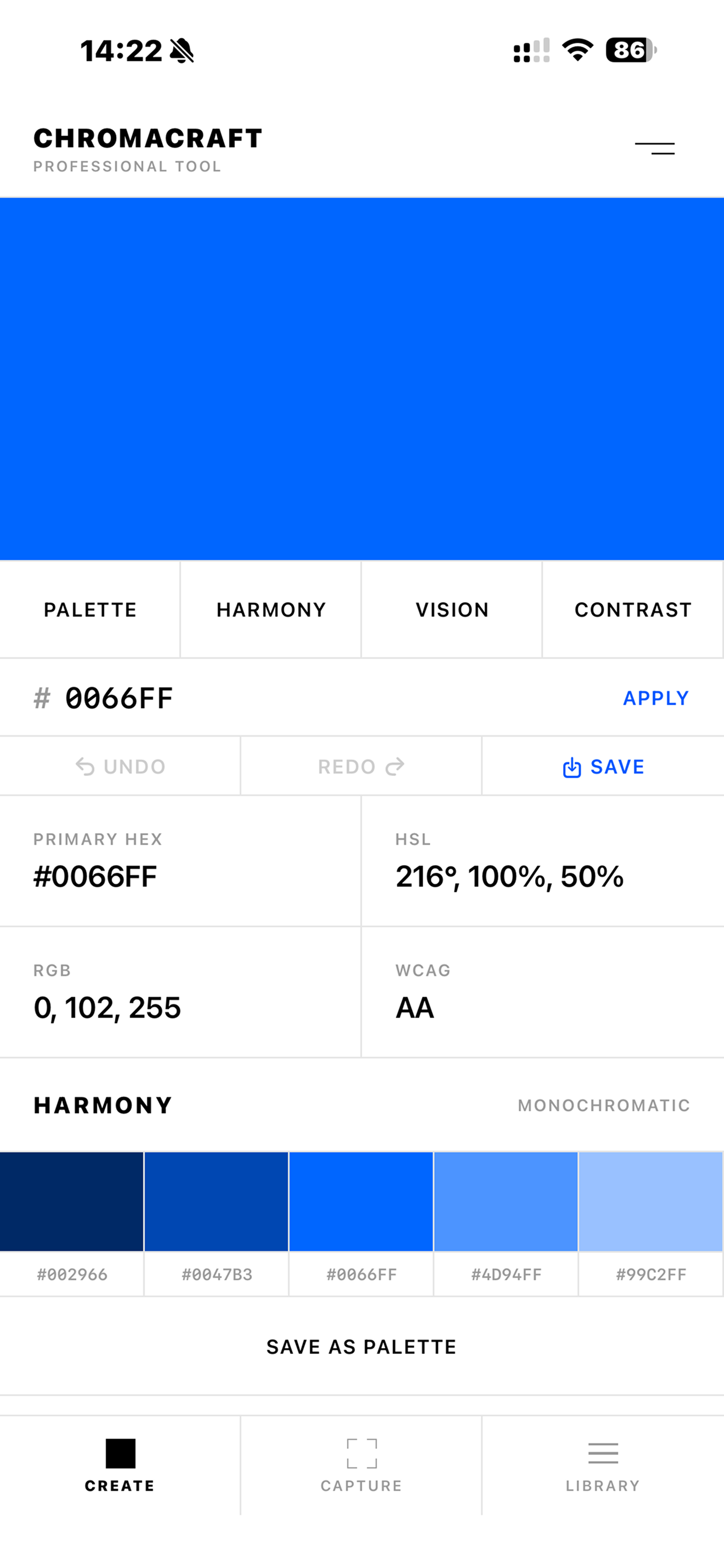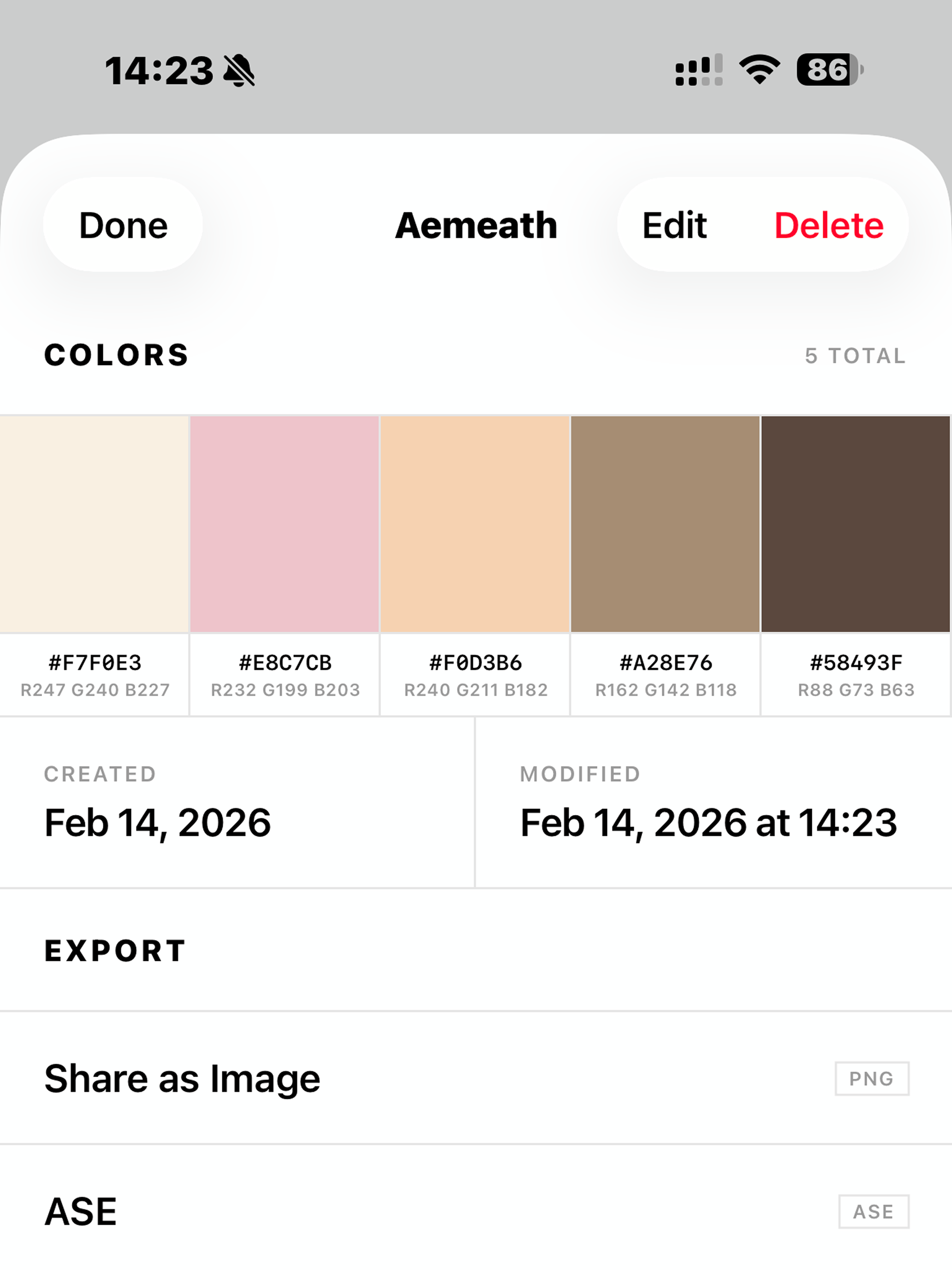Export palettes as ASE, CSS Variables, Swift, Android XML, Kotlin Compose, Tailwind CSS, or JSON.